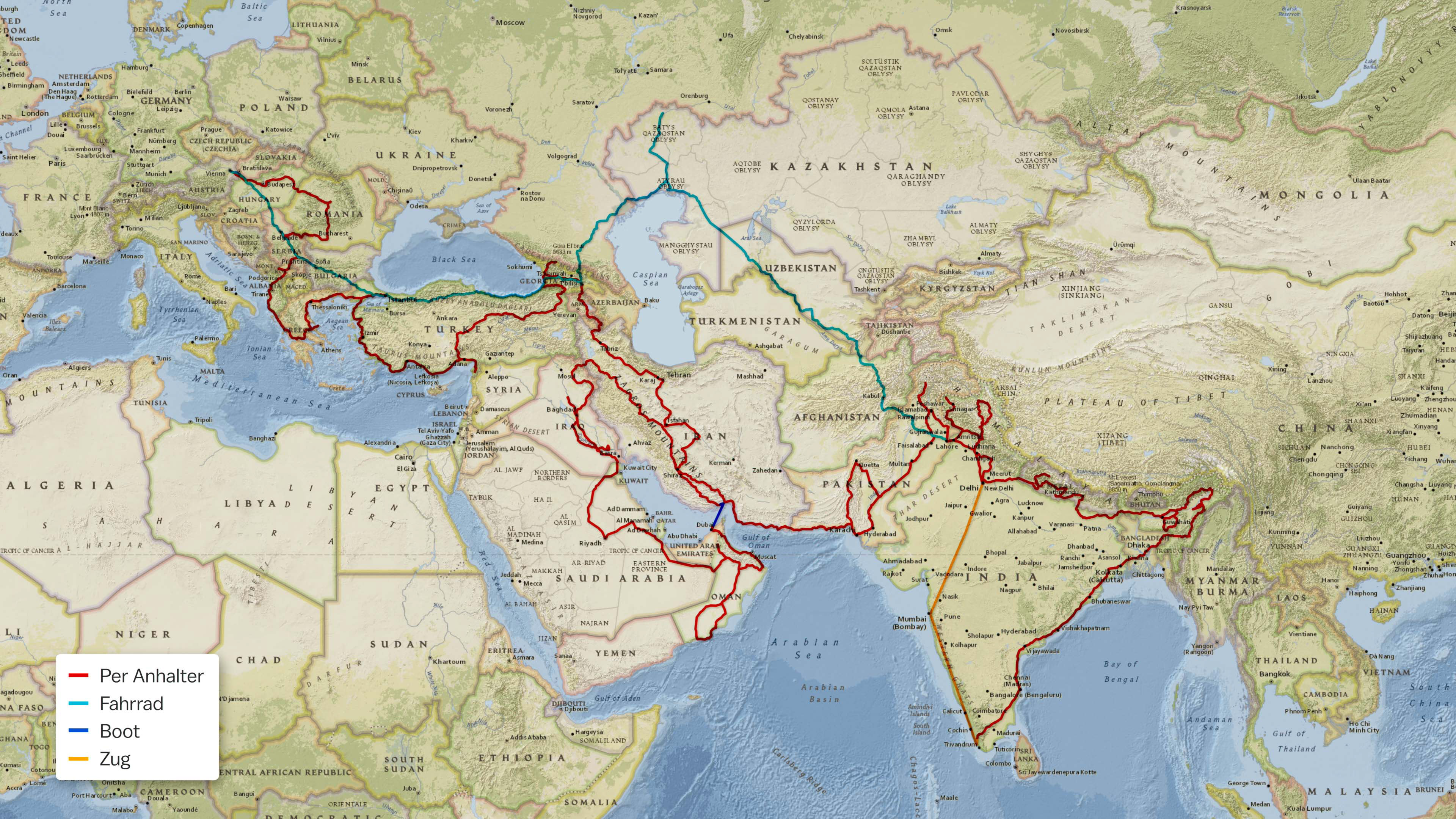 Mit 21 Jahren bricht Valentin Macke auf. Er trampt nach Osten: Türkei, Kaukasus, Iran, Pakistan, Indien. Dann mit einem alten Drahtesel aus Pakistan zurück durch Afghanistan, Kasachstan und Russland. Das Abenteuer führt von Dschungel und Wüsten bis ins Hochgebirge. Unterwegs vertraut er auf Lastwagenfahrer, Nomaden und Taliban.